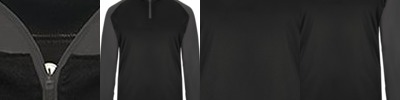 - Ribbed v-notch, collar, cuffs, and waistband